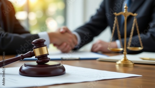 Close up of a judge's gavel on a wooden table with legal documents and scales of justice in the background, blurred image of lawyers shaking hands, concept for law firm