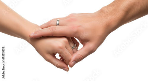Close up of a man and woman holding hands wearing wedding rings isolated PNG with Transparent Background