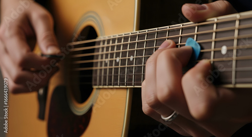 Close up of a musician strumming acoustic guitar strings with pick, creating music