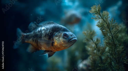 Close up of a piranha fish with sharp teeth swimming in a dimly lit aquarium with aquatic plants creating a moody underwater scene