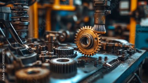 Close up of a robotic arm cleaning a metal gear with a brush in a factory.