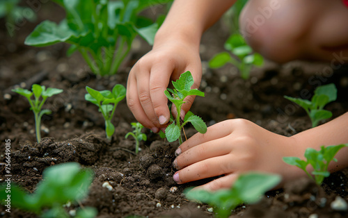 Close up of a small child hands planting plants in the soil, gardening in the backyard, childhood in the village or on the farm