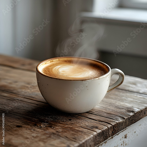 Close up of a steaming coffee cup on rustic wooden surface lifestyle beverage