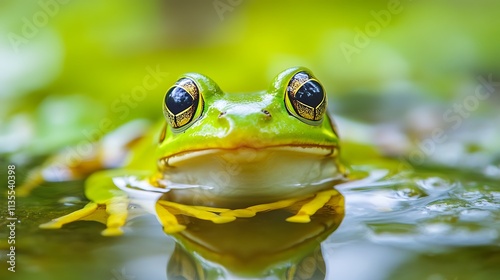 Close up of a vibrant green frog in water. Concept of wildlife, nature, and amphibian.