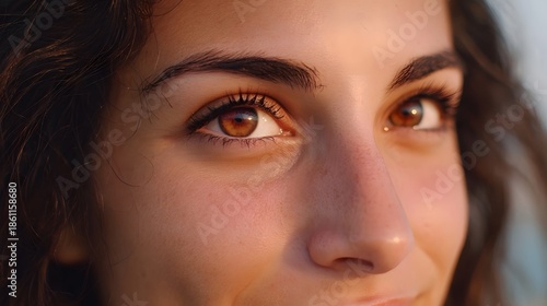 Close up of a woman s warm serene eyes at golden hour capturing a gentle smile and the soft glow of twilight