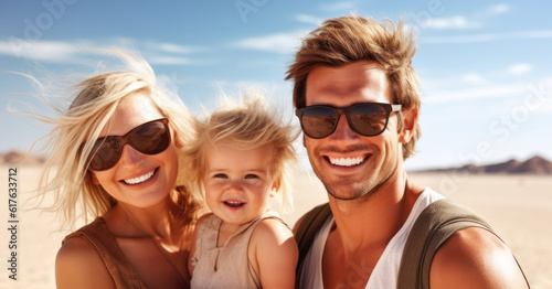Close up of a young couple with their baby while on a beach holiday. Generative AI