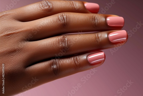 Close up of African American woman with pink manicure, showing her beautiful nails closeup on pink background. Generative AI