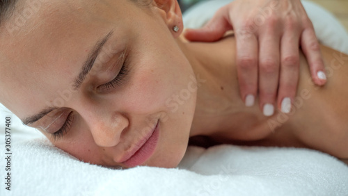Close up of an young woman is receiving a back massage and spa treatment in a luxury wellness center.