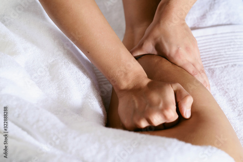 Close up of anti cellulite massage for young woman in wellness center. Perfect skin fat burning beauty concept