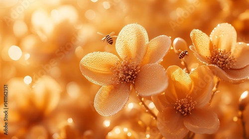 Close up of apricot colored flowers with water droplets and two bees in a bokeh filled background