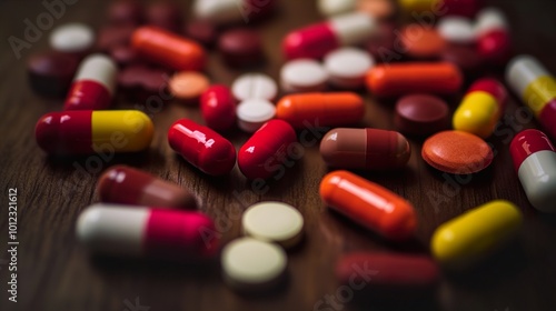 Close Up of Assorted Pills and Capsules on a Wooden Surface