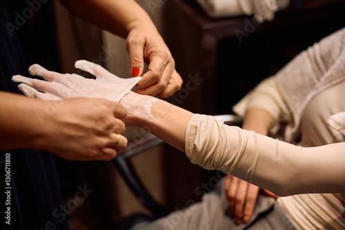 Close up of beautician applying hydrating gloves on woman's hand during skin care treatment at salon.