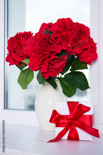 close up of beautiful hydrangea flowers in vase and gift box on