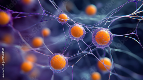close up of biological structure showcasing vibrant orange spheres connected by intricate networks of cells, illustrating complexity of cellular interactions and life