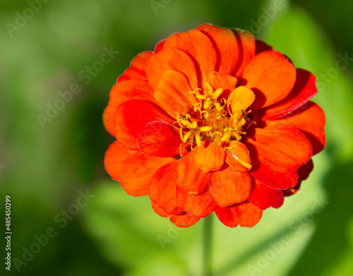 Close up of bright orange zinnia flower with variegated green background