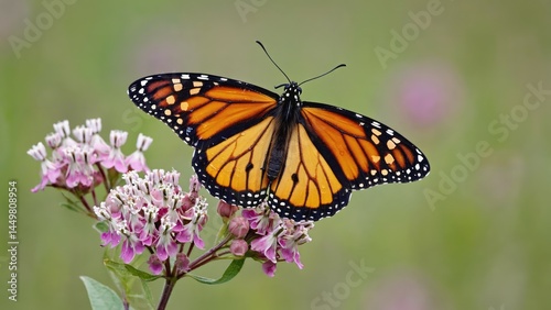 Close up of butterfly wings open on wildflower with blurred meadow background