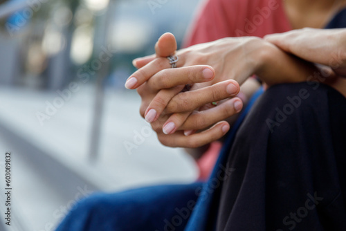 Close up of couple holding hands and relaxing together outside