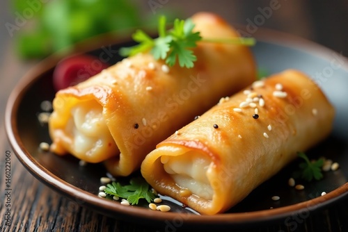 Close up of crispy spring rolls, garnish, sesame seeds, yummy, snack, dinner