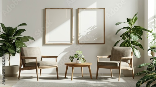 Close up of empty wooden picture frame on wall in mid century modern home with black armchair and coffee table, plant leaves, white walls and minimalist interior design