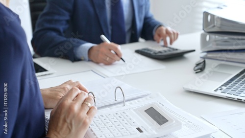 Close up of female accountant hands using calculator while collaborating with male colleague in office, calculating taxes and analyzing financial data. Audit and taxes in business