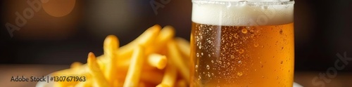 Close up of frosty mug of beer next to plate of hot French fries, relaxation, crispy