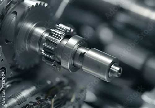 Close up of intricate metal gears and engine components demonstrating mechanical precision engineering and automotive technology used in powertrain assembly