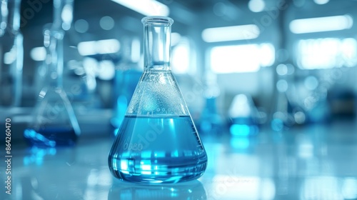 Close up of laboratory test tubes with chemicals on white background with subtle blue illumination, science and research concept, banner, empty space for text