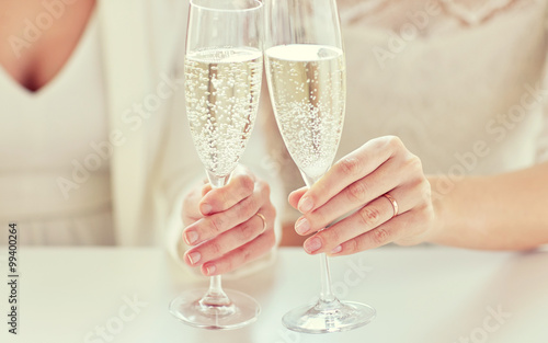 close up of lesbian couple with champagne glasses