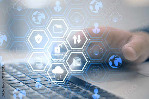 Close up of male hand using laptop keyboard with creative open data hexagonal hologram on dark blue background. Data management and innovation concept.