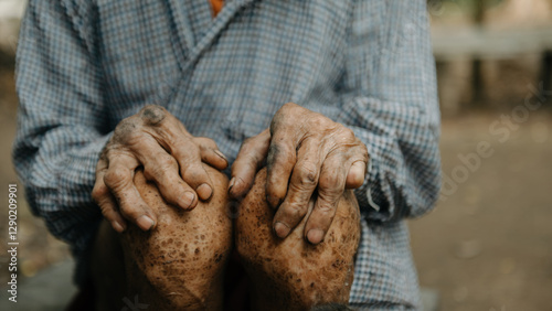 Close up of male wrinkled hands, old man is wearing skin disease and anxiety Copy space.