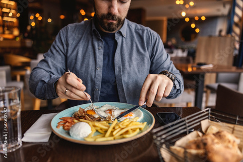 Close up of man eating breakfast in a restaurant.