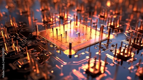 Close up of micro circuit board, complex electronic components and paths. Generative AI