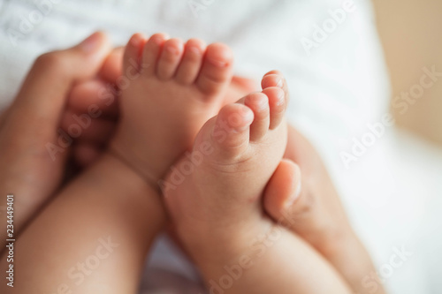 Close up of newborn baby feet. Baby's feet in the mother hands. Baby. Cozy. Love. Family.