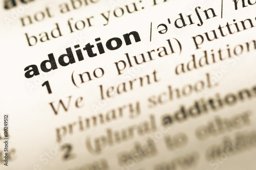 Close up of old English dictionary page with word addition