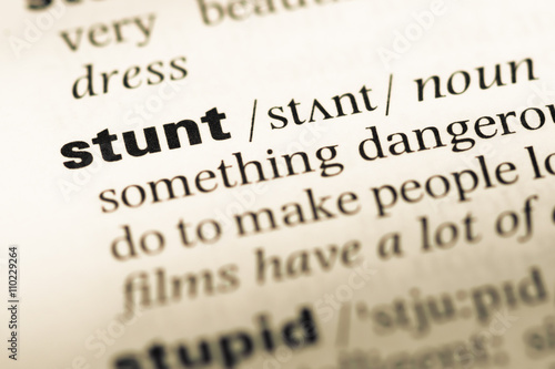 Close up of old English dictionary page with word stunt