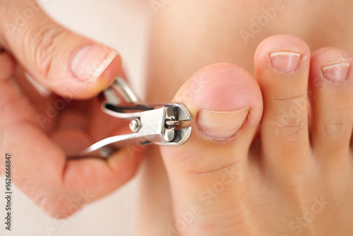Close up of person using nail clippers to trim toenails fingernails clipping
