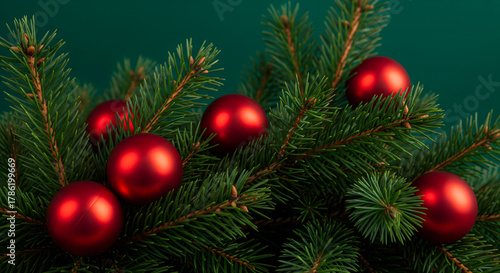 Close up of rich green pine branches decorated with red christmas ornaments