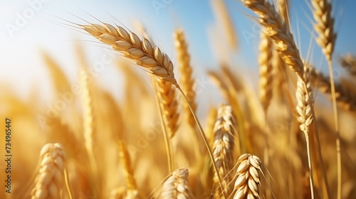 Close up of ripe golden wheat ears, field of wheat in a summer day, sun flare. Harvesting period. Generative AI