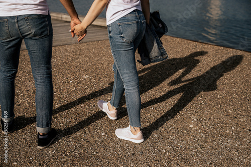 Close up of romantic couple hold hands and walk along the shore