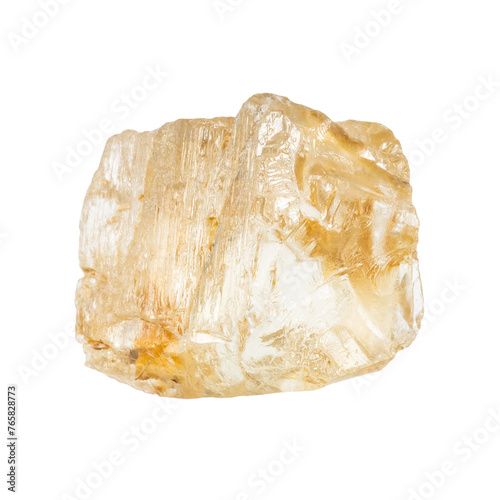 close up of sample of natural stone from geological collection - raw yellow scapolite crystal isolated on white background from Tajikistan