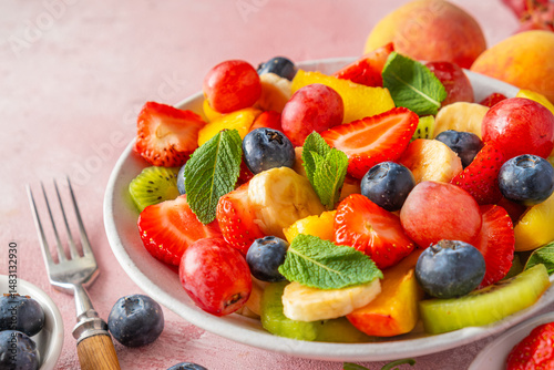 Close up of summer colorful fruit salad in a bowl on pink background. Healthy vegan food with vitamins. Mixed strawberries, grapes, banana, kiwi, blueberries, peach, mint for diet lunch