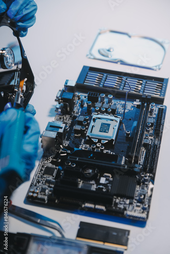 Close up of Technician measuring voltage electronic circuit board television, Service after sale fix electric equipment within insurance.