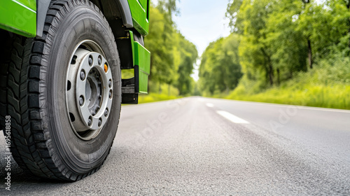 Close up of truck wheel on road, showcasing tire tread and surrounding greenery