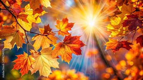 Close up of vibrant autumn leaves with sun rays filtering through, creating a warm and cozy atmosphere, autumn, leaves, close up