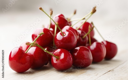 Close up of vibrant red cherries, diagonal shot on a light wooden surface, showing detail and texture of the fruit, perfect for food and nature projects