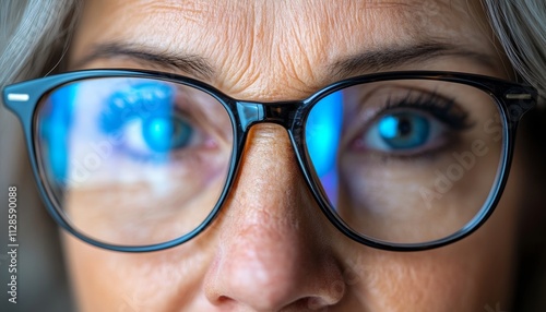 Close Up of Woman Wearing Glasses. Eyes of Senior Woman with Glasses. Wrinkles and Vision Concept.