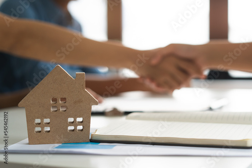 close up on model house on the table have client doing handshake business as background