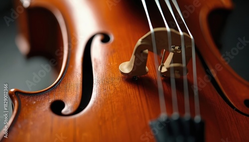 Close up photo of cello string instrument. Brown polished wood with intricate F-holes, bridge visible. Represents classical music, orchestra performance, art, fine craftsmanship. Musical device makes