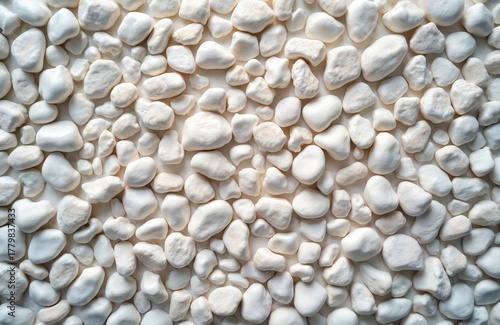 Close up photo of white decorative stones. Smooth polished pebbles create a natural texture. Rounded rocks ideal for background or design projects. Perfect for spa or zen concepts.