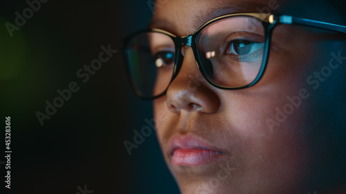 Close Up Portrait of a Cute Young Teenage Multiethnic Black Girl in a Dark Cozy Room at Home. Young Female Wears Glasses that Reflect School Homework from Her Laptop Computer Screen in Them.